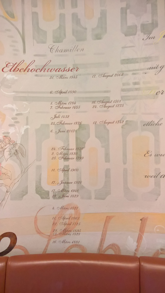 Die Markierungen im Hotel zeugen von den Hochwasserständen. |